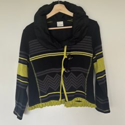 En grå stickad kofta med knappar framtill och fickor. Den har även läderdetaljer på armbågarna. Storlek 40.