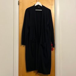 En svart kofta med långa ärmar och ett bälte. Koftan har en avslappnad passform. Passar S-M.