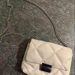 Vit stickad kofta med dragkedja och huva. Koftan har en kortare modell med fransar nedtill.