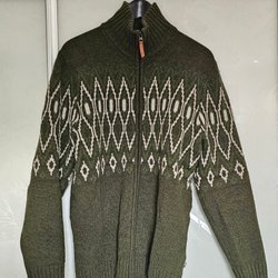 Rosa stickad jacka med dragkedja fram. Jackan har en krage och två fickor fram. Detaljer med vita broderier.