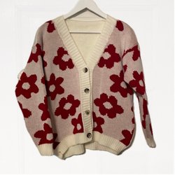 Vit stickad kofta med körsbärsbroderier. Koftan har en v-ringning, långa ärmar och har en öppen front. Koftan är endast använd en gång och är i ett mycket fint skick! Material är i 100% polyester (märkesetiketter saknas).