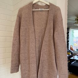 Rosa stickad kofta med fickor och knappar. Koftan har en avslappnad passform och är perfekt för kyliga dagar.
