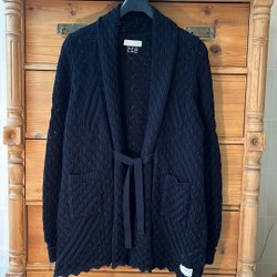 Stickad kofta med ett traditionellt mönster i en blandning av färger som rosa, grått, brunt och vitt. Den har en omlottdesign med ett band i midjan för att justera passformen. Koftan har en krage och långa ärmar.