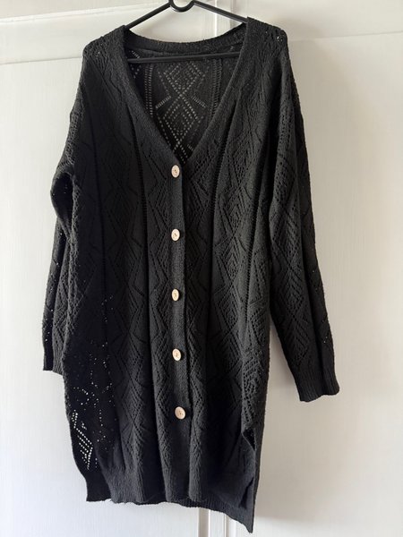 Svart, stickad kofta med v-ringning och knappar. Koftan har ett fint hålmönster och två fickor fram.