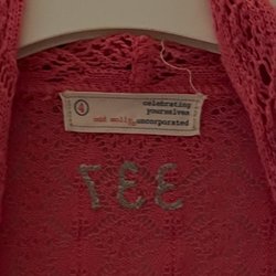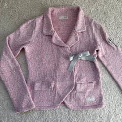 Rosa virkad koftan med lång ärm och fickor fram. Den har knappar fram. Storlek 0, så kanske mer xs. Jag är s och för mig funkar den men sitter slimmad .