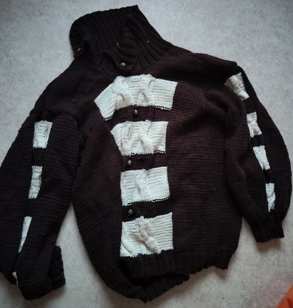 Brun stickad kofta med vita detaljer. Koftan har knappar framtill och ett unikt mönster.