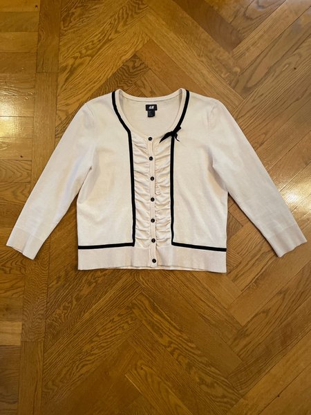 Kofta med lång ärm, svarta detaljer och en liten svart rosett. Koftan har knappar framtill.