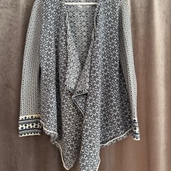 En vit stickad kofta med spetsdetaljer och en rosett i midjan. Kofta har långa ärmar och en v-ringning.