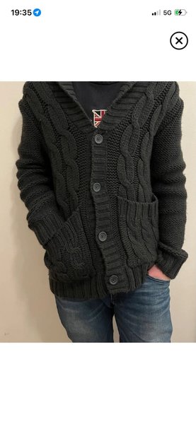 Grå stickad cardigan med huva, knäppning fram och fickor. Cardigan har ett flätat stickat mönster.