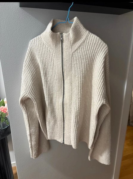 Beige stickad kofta med hög krage och dragkedja framtill.