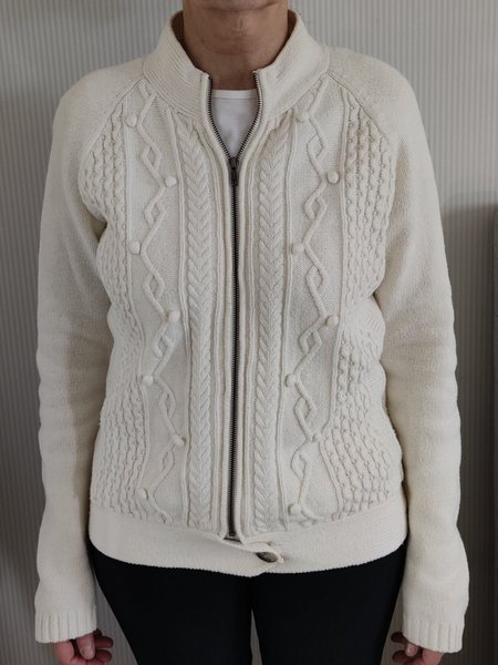 Vit stickad kofta med dragkedja framtill och ett dekorativt stickat mönster.