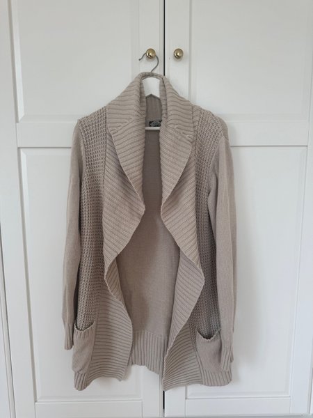 Beige stickad kofta med bred krage och fickor fram.
