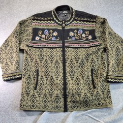 Grön kofta med dekorativa svarta detaljer och knappar. Jackan har en unik design med en rund halsringning och en asymmetrisk nederkant.XL väldigt unik kofta. Ull och polyacryl.