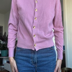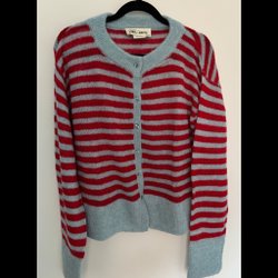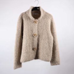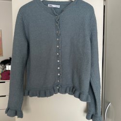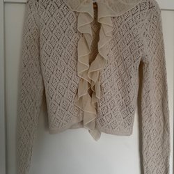 Stickad kofta med hög krage och dragkedja framtill. Koftan har ett vackert flätmönster.