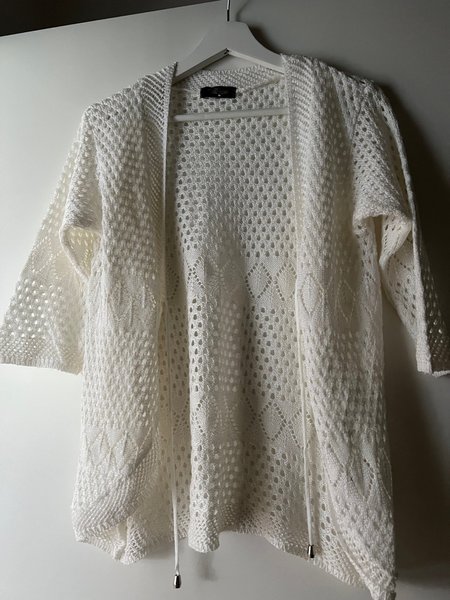Vit, öppen kofta med trekvartsärmar och ett fint, genombrutet mönster. Koftan har knytband framtill.