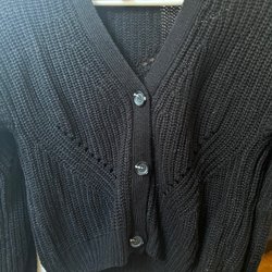 Svart kofta med långa ärmar och knappar framtill. Den har en klassisk krage och är dekorerad med små svarta pärlor.
