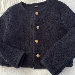 Marinblå jacka med dragkedja framtill och ribbstickade muddar vid ärmslut och nederkant. Jackan har en subtil textur som ger den ett intressant utseende.