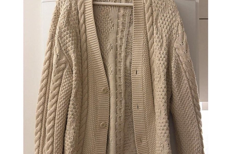 En stickad kofta med en detaljerad flätstickning över hela plagget. Koftan har en V-ringning och knäppning framtill med matchande knappar. Ärmsluten och nederkanten är ribbstickade.
