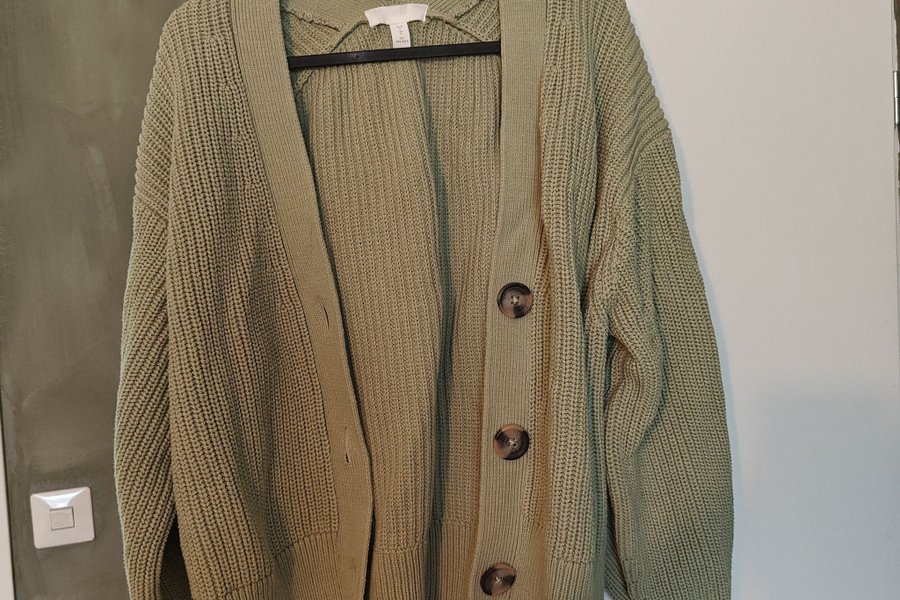 En snygg grön stickad kofta med knappar framtill. Den har långa ärmar och en lös passform. Perfekt för hösten och vintern. Knappt använd.