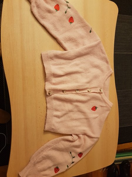En ljusrosa kofta med knappar framtill. Koftan har långa ärmar med broderade jordgubbar och gröna blad. En jordgubbe är även broderad på framsidan av koftan.