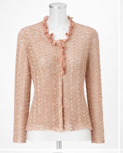 En elegant kofta med långa ärmar och en vacker krage med volangdetaljer. Koftan har en genombruten design och knäppning framtill med små knappar.