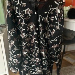 Långärmad lätt kofta med v-ringning och knappar framtill. Koftan har ett fint mönster i svart och silver.