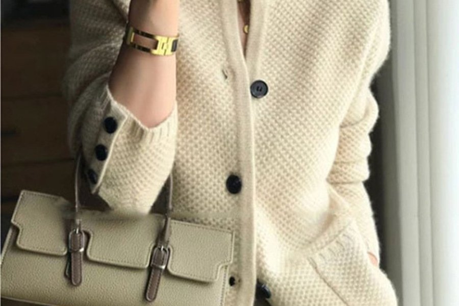 A cream-colored cardigan with a textured knit pattern, featuring a stand-up collar and black buttons down the front. The cardigan has long sleeves with button details on the cuffs and two front pockets. It is styled with a gold-toned bracelet and a light beige handbag with buckle closures. S size.
