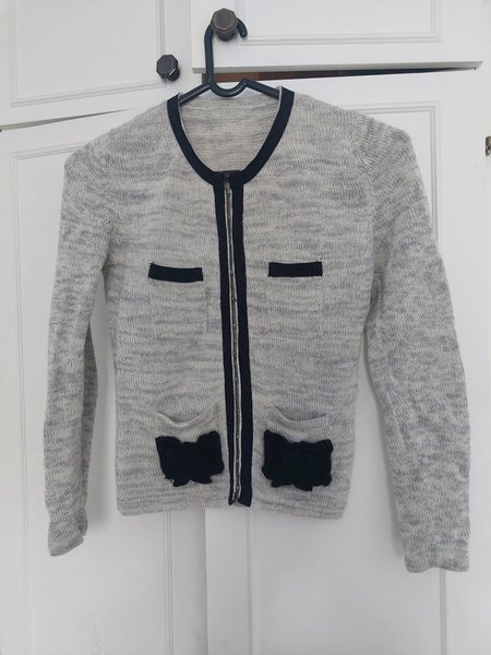 Grå stickad kofta med dragkedja framtill. Koftan har svarta detaljer runt halsringningen och längs dragkedjan. Två fejkfickor med svarta band upptill och två påsydda svarta rosetter nedtill.
