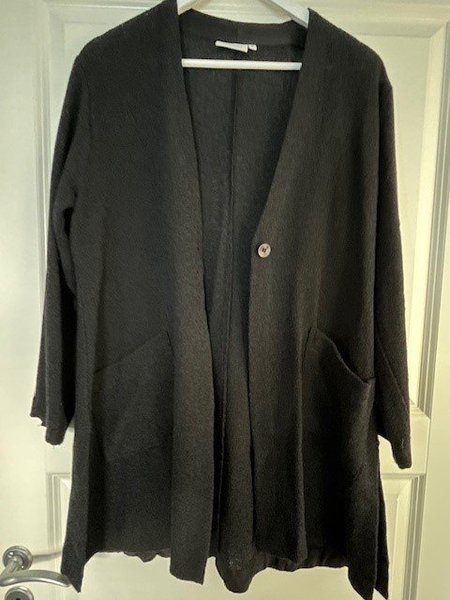 Svart kofta med en knapp framtill och två fickor. Koftan har en avslappnad passform och långa ärmar.