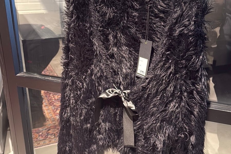 Svart fuskpälskofta med långa fransar som ger en fluffig textur. Koftan har en öppen design utan knäppning och en dekorativ rosett i satin på framsidan