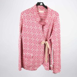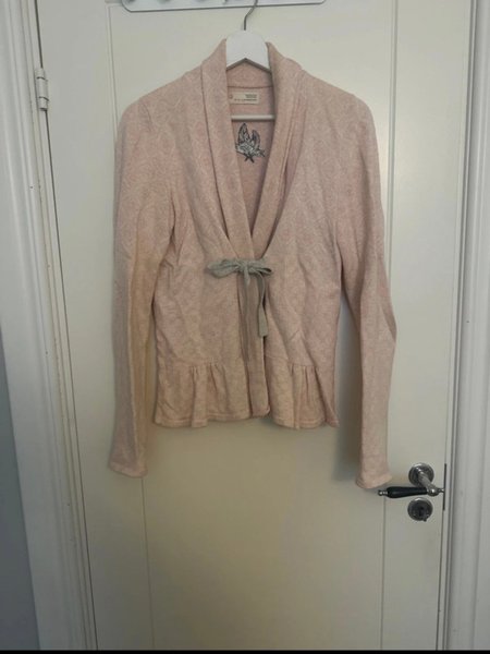 Ljusrosa kofta med knytband framtill. Koftan har en volangkant nedtill och långa ärmar. Kragen är bred och faller mjukt.