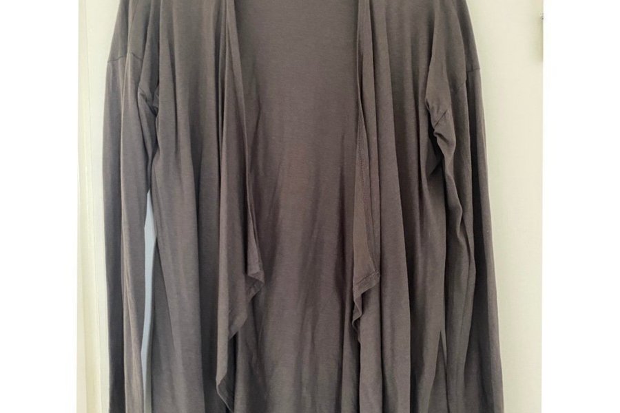 Grå, långärmad kofta med öppen front. Perfekt för lager-på-lager-stilen.