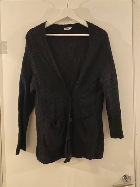 Snygg svart kofta med knappar framtill och fickor. Dessvärre något förstörd i tvätten, men är fortsatt bärbar. Så passa på att återanvända denna härliga kofta.