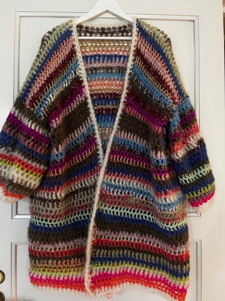Finstickad kofta i en färgstark design med ränder i olika nyanser. Koftan har en öppen front och långa ärmar. Passar perfekt för att lägga till en färgklick i din garderob.Handmade