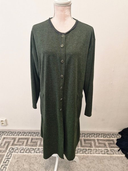 Grön kofta med långa ärmar och knäppning framtill. Den har en dekorativ kant runt halsen och praktiska fickor på sidorna.
