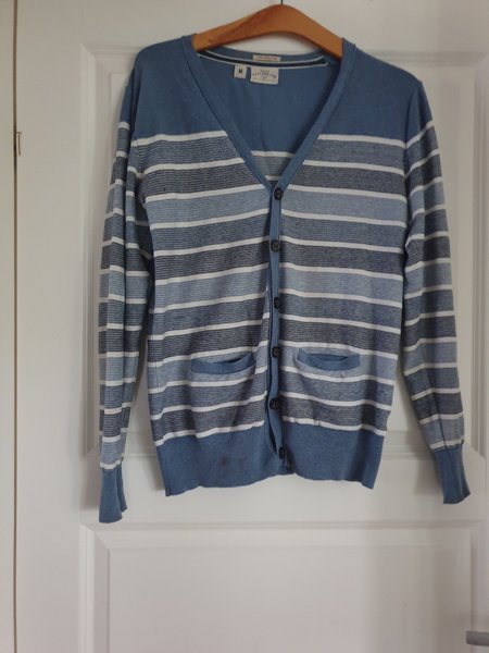 Blå cardigan med horisontella ränder i olika nyanser av blått, och beige. Den har en V-ringning, knappar framtill och två fickor.