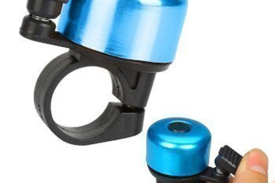 En blå cykelklocka med en svart klämma. Klockan är lätt att installera och använda.
