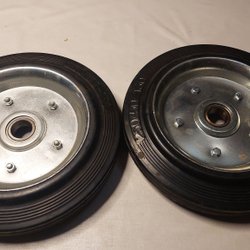 Dessa är solida gummidäck med stålnav, troligen avsedda för handtruckar eller skottkärror.