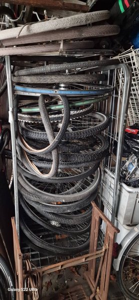 Ett parti med cykelhjul och däck i olika storlekar och utföranden. Innehåller både kompletta hjul med däck och lösa däck. nån kan vara trasig. vagn ingår ej