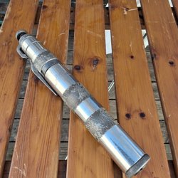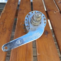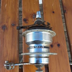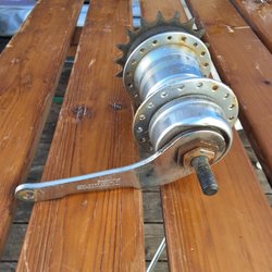 Ett cykelnav av märket Super Granat. Navet är i metall och har en silverfärg. Det har en kugghjulskassett och en bromsarm.