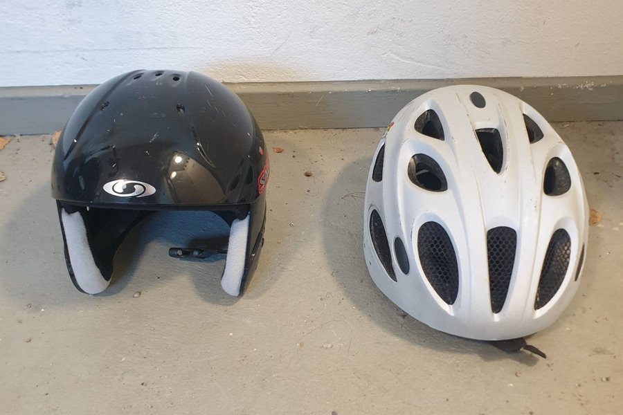 Ett set med två hjälmar. En svart skidhjälm och en vit cykelhjälm. Både för 50.