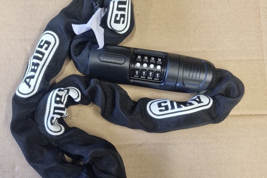 ABUS cykellås med en robust kedja. Låset har en fyrsiffrig kombinationskod för att säkra din cykel.