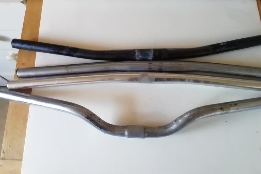 Fyra cykelstyren i olika utföranden. Ett svart styre och tre silverfärgade styren.