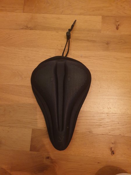 Svart gelsadelöverdrag för cykel. Fästes med hjälp av dragsko.