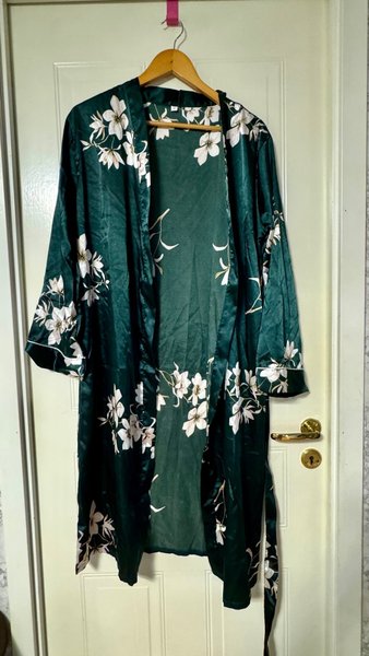 Grön kimono med blommigt mönster och knytband. Kimonon har vita blommor och detaljer. Använd 1 gång.