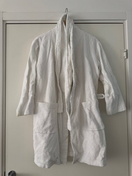 Vit badrock med två fickor framtill och ett knytband i midjan. Badrocken har långa ärmar och en bred krage.