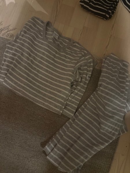Ett set med en långärmad tröja och byxor med ett randigt mönster i grått och vitt.