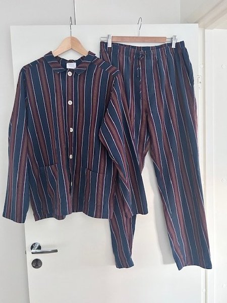 Ett randigt set med en skjorta och ett par byxor. Skjortan har långa ärmar, krage och knappar framtill. Byxorna har resår och dragsko i midjan.