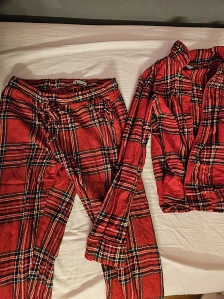 Röd flanell pyjamas set med ett klassiskt rutmönster. Setet består av en långärmad skjorta och ett par byxor med resår i midjan.