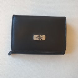 Svart plånbok med silverfärgat spänne. Plånboken har ett fack med dragkedja och plats för kort.